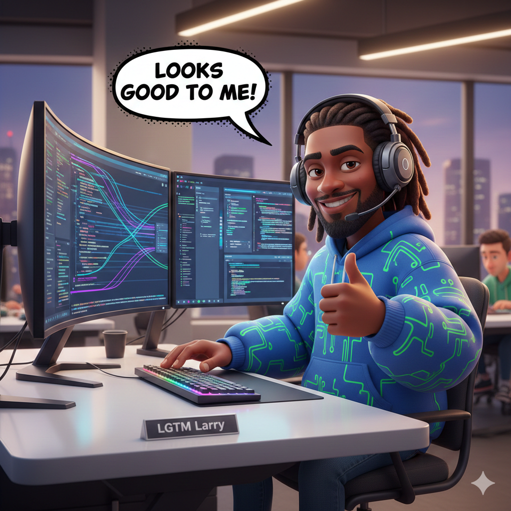 Hi there. I'm LGTM Larry, the Principal Engineer, and the reason this platform exists at all. Every button you click, every page that loads, and every pixel that dares to render, that's my code. You're welcome.