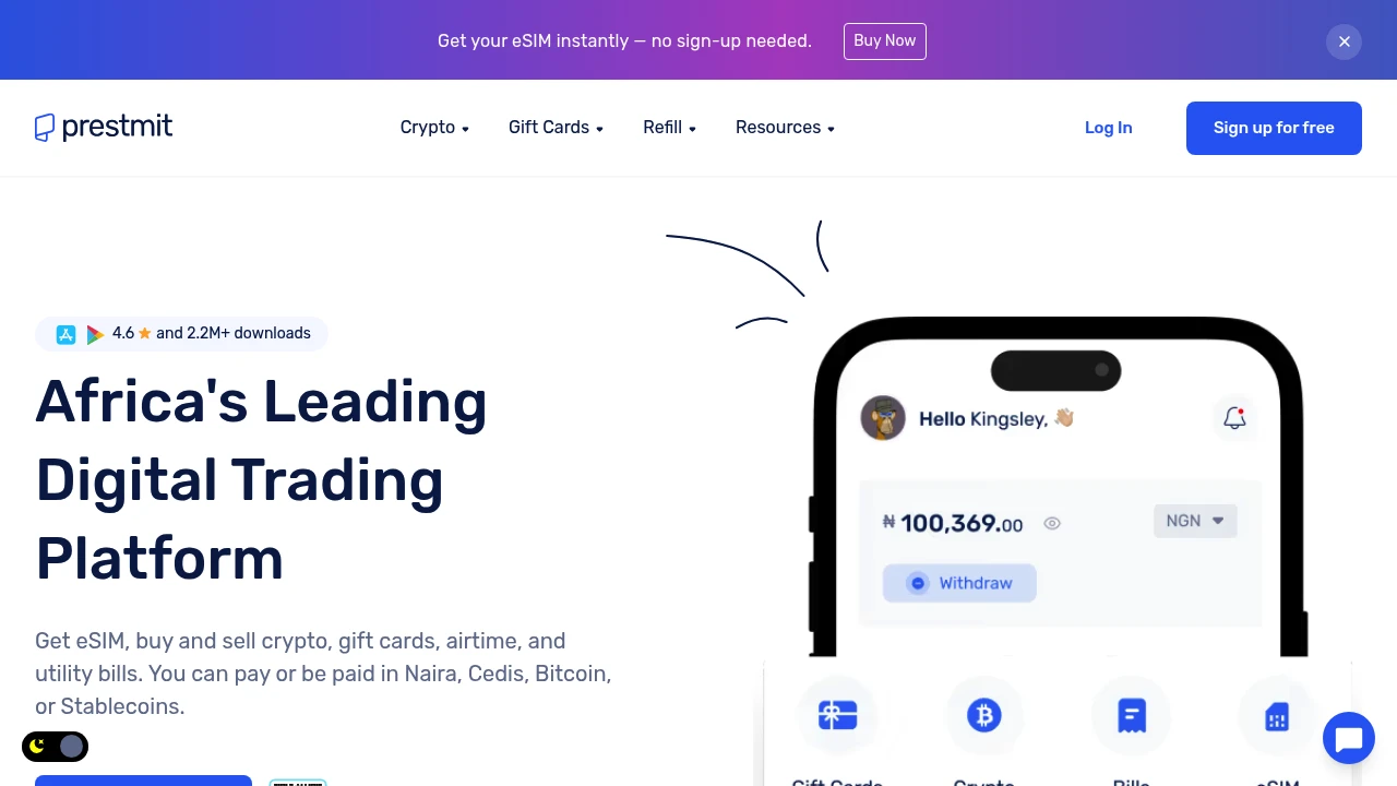 Prestmit is a digital trading app used across Africa for crypto, gift cards, and eSIM services, with support for local and crypto payouts. You can buy and sell gift cards, convert cryptocurrencies, activate eSIMs, and handle everyday needs like airtime top-ups and utility bill payments from one platform.